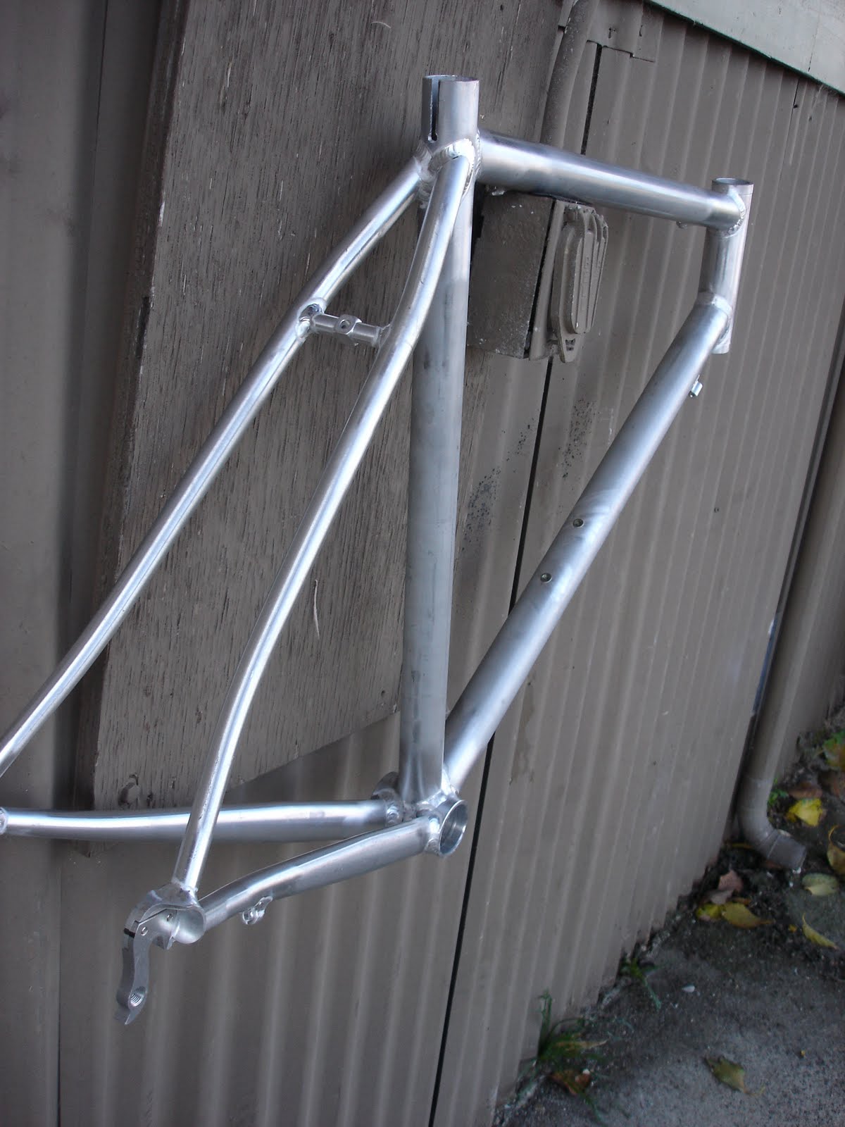 If this bike looks old to you, it is. I built this frame in 1978 and it was my first. I rode it for a few years but it never really rode right so about 16 years ago I removed the rear triangle to go about fixing it. From that point until yesterday it hung from a hook , neglected but not forgotten. I spent a few hours yesterday and a few today and now it rides reasonably well. I'm riding it around without paint just to be sure that it will be worth the cost of powdercoat and clearcoat. I'm shooting for the original color and maybe I can find the original lettering that I used. This frame was made 6 years before I came up with the Rock Lobster name. The original decals said " Routier" which was the name of the street I lived on at the time. Maybe I should call it "Trescony"-the street where I live now.