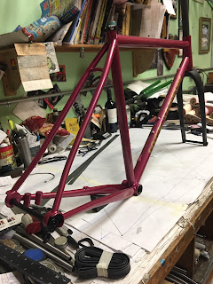 I have been very fortunate to be able to make a living as a bicycle frame builder. It has not always been a happy journey but the help and support I have gotten from the Santa Cruz cycling community and some of my fellow builders had made this unlikely work path possible. As I near the time when I'll be slowing down and cutting back on my work hours I feel that this last part of my career has to involve some giving back to the people that have figured large in my work life. This is one small step in that direction......too bad that someone died before getting their frame back but in my mind I think that this bike is really where it is supposed to be.