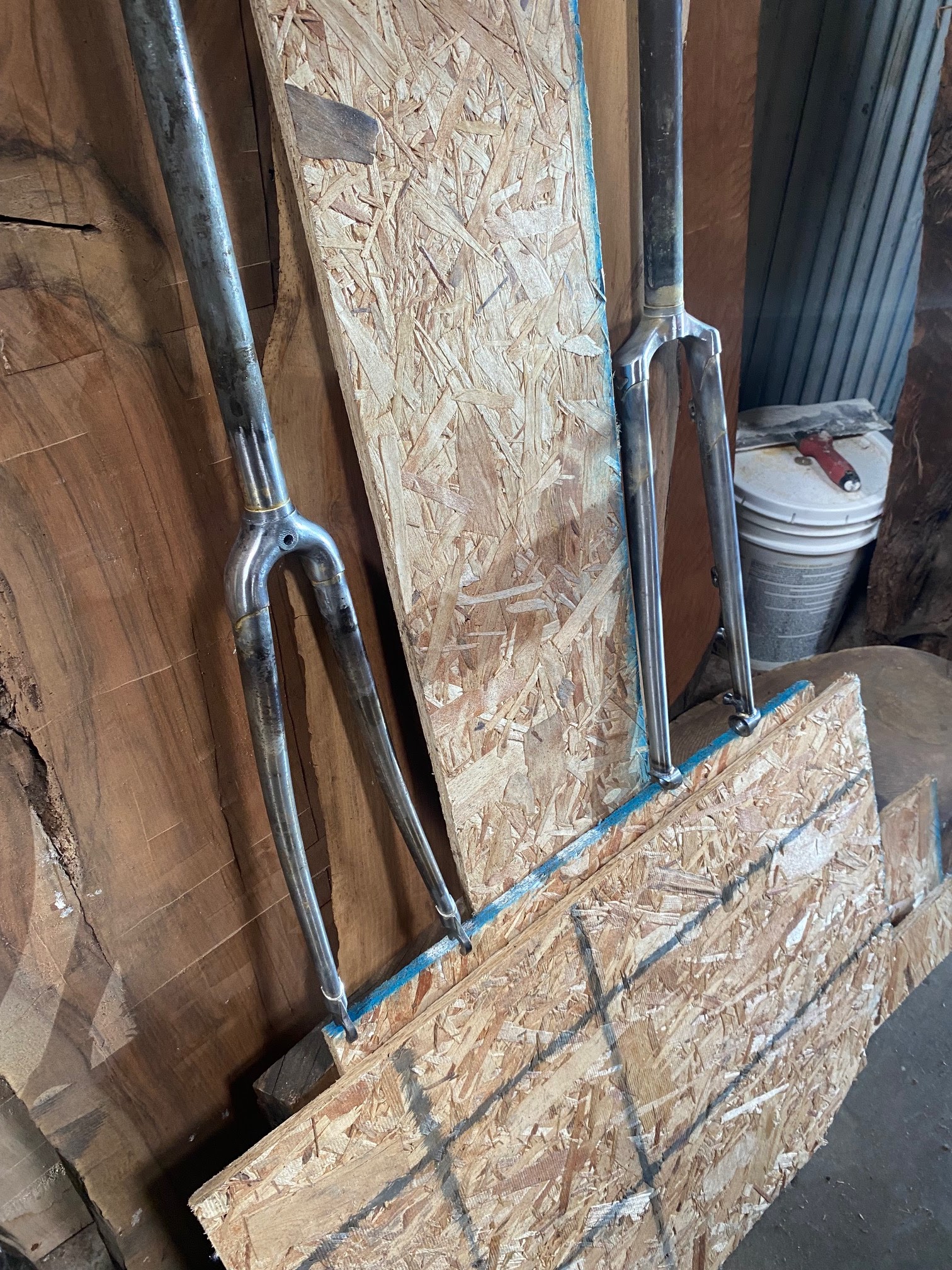 Yes, this week was fork and frame prep week- had a lot of stuff to ship out- still do. The closer of the two forks is a replacement for a Della Santa fork that got destroyed.....don't know how but it is really bent. The second fork goes with a frame I built last week. Glad to have the whole package complete and ready for paint.
